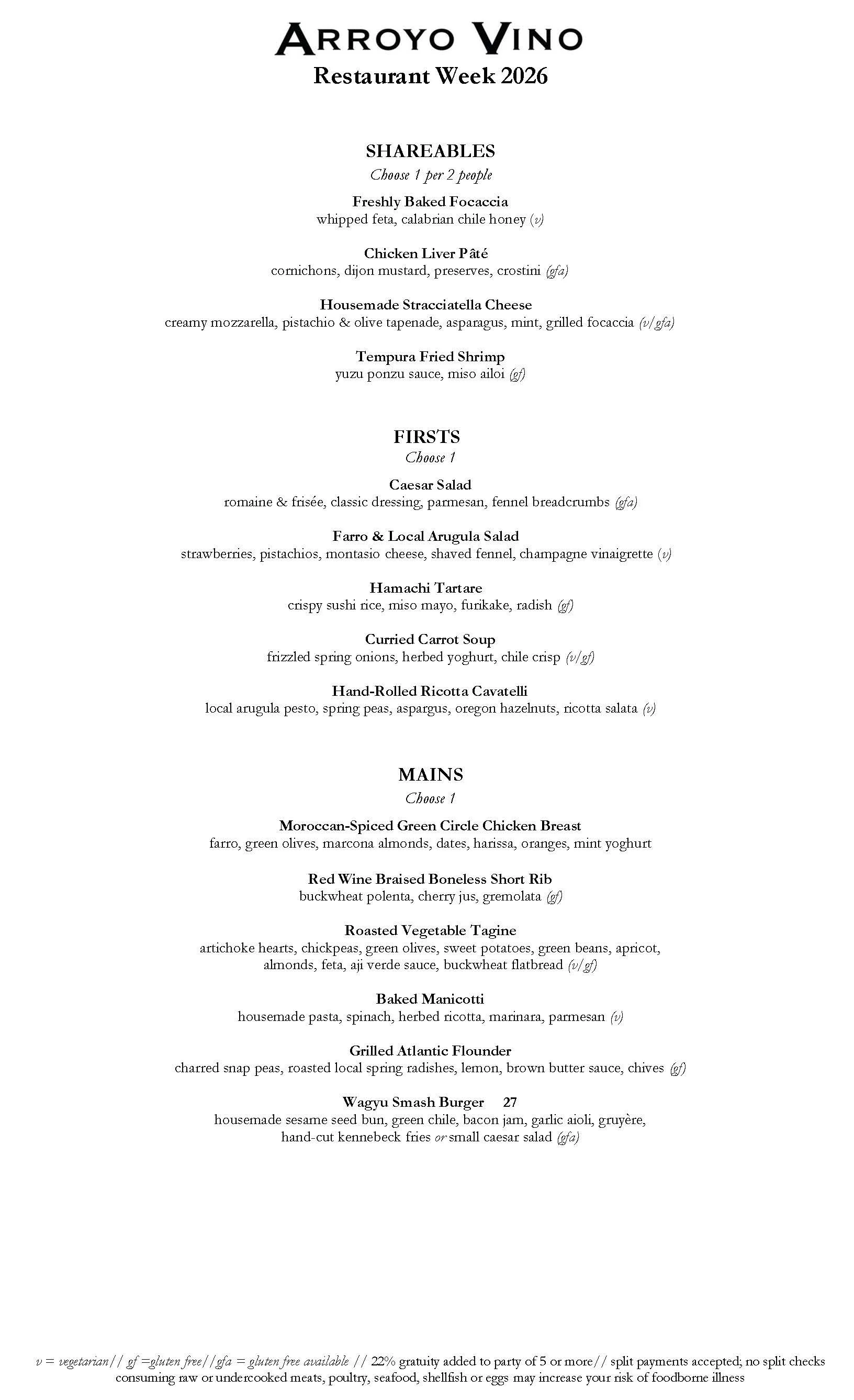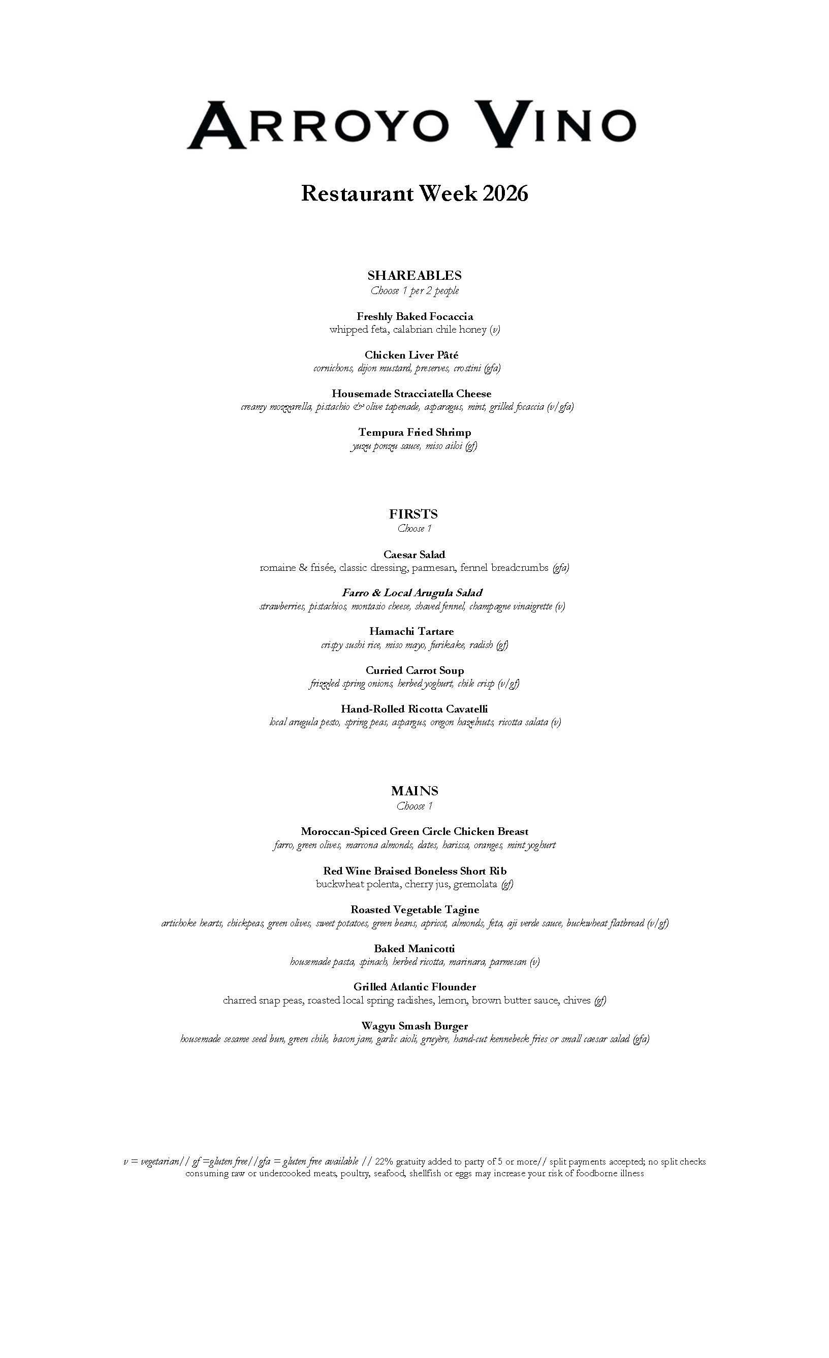 For Restaurant Week 2026, Arroyo Vino offers a 3-course menu focused on savory dishes. Guests select one item from the list of Shareables for every two people at their table. Each guest then selects a First and a Main. Not to worry, dessert will be available for those with a sweet tooth!