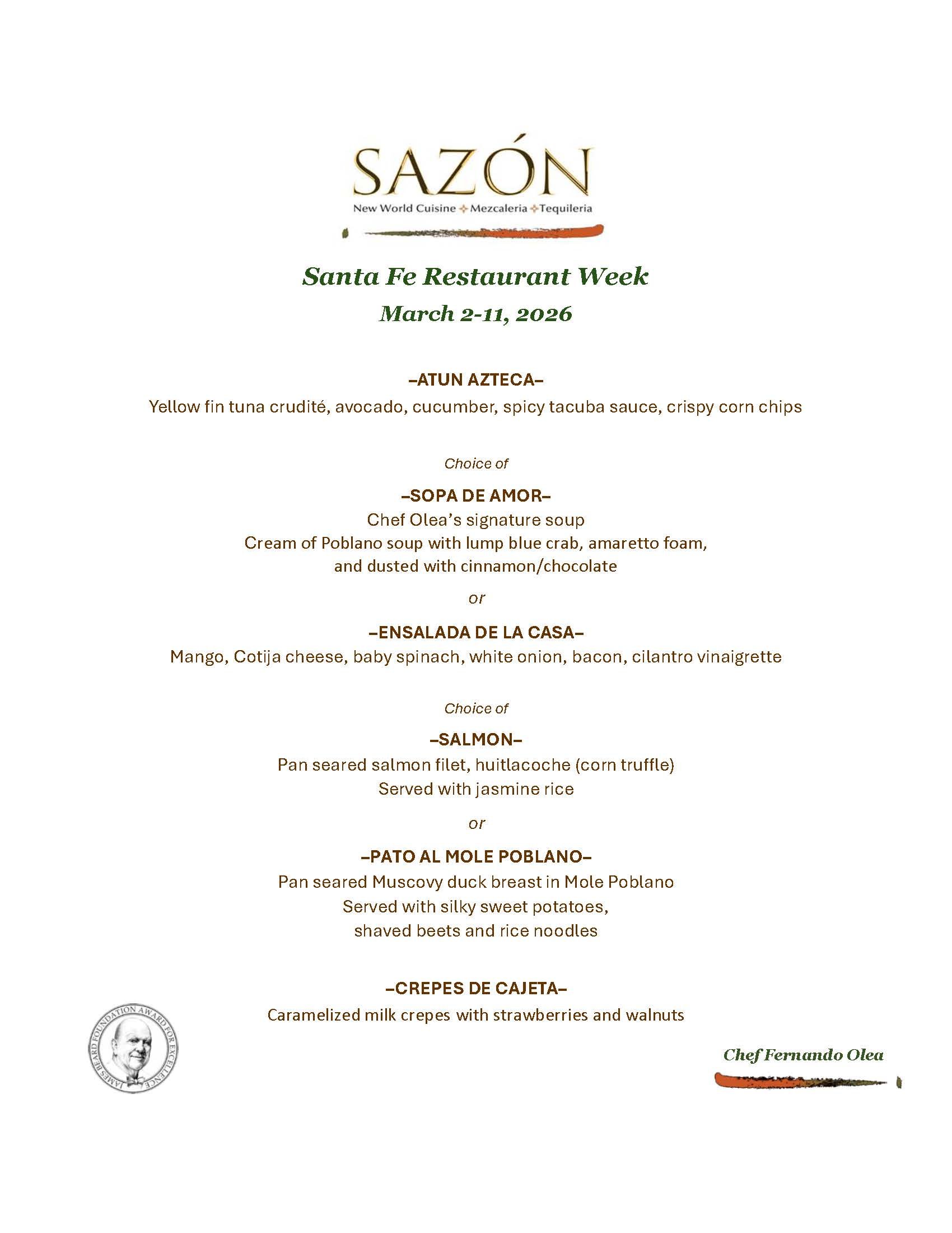 Sazón is a fine dining restaurant with an award-winning wine list and one of the country’s largest tequila and mezcal selections. It continues to be recognized for outstanding service, extraordinary ambience, and a creative menu. Inhabiting a historic building in the heart of Santa Fe’s downtown Plaza area, it is ranked #2 in the U.S. for fine dining by Trip Advisor! Sazón also has earned AAA’s prestigious 4 Diamond award and was named sixth in the U.S. for fine dining by Forbes magazine. Chef Olea is honored to have won the prestigious 2022 James Beard “Best Chef of the Southwest” Award.